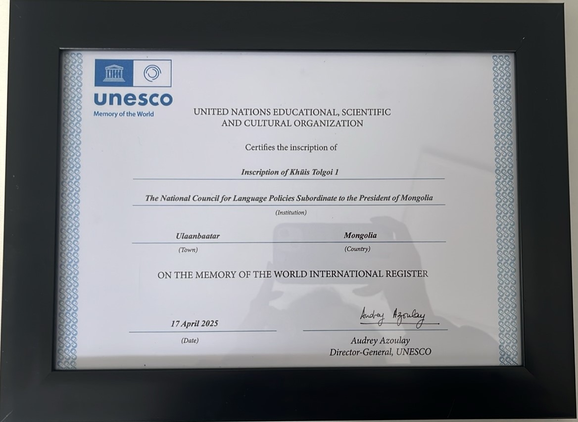 Монгол Улсаас ЮНЕСКО-д бүртгэгдсэн соёлын өвийн батламж гардуулах ёслолын арга хэмжээг 2025 оны 11 дүгээр сарын 21 буюу Өвлийн тэргүүн сарын шинийн нэгэн, Эзэн Богд Чингис хааны мэндэлсний 863 жилийн ой, “Монгол бахархлын өдөр”-өөр Чингис хаан Үндэсний музейд зохион байгуулав.