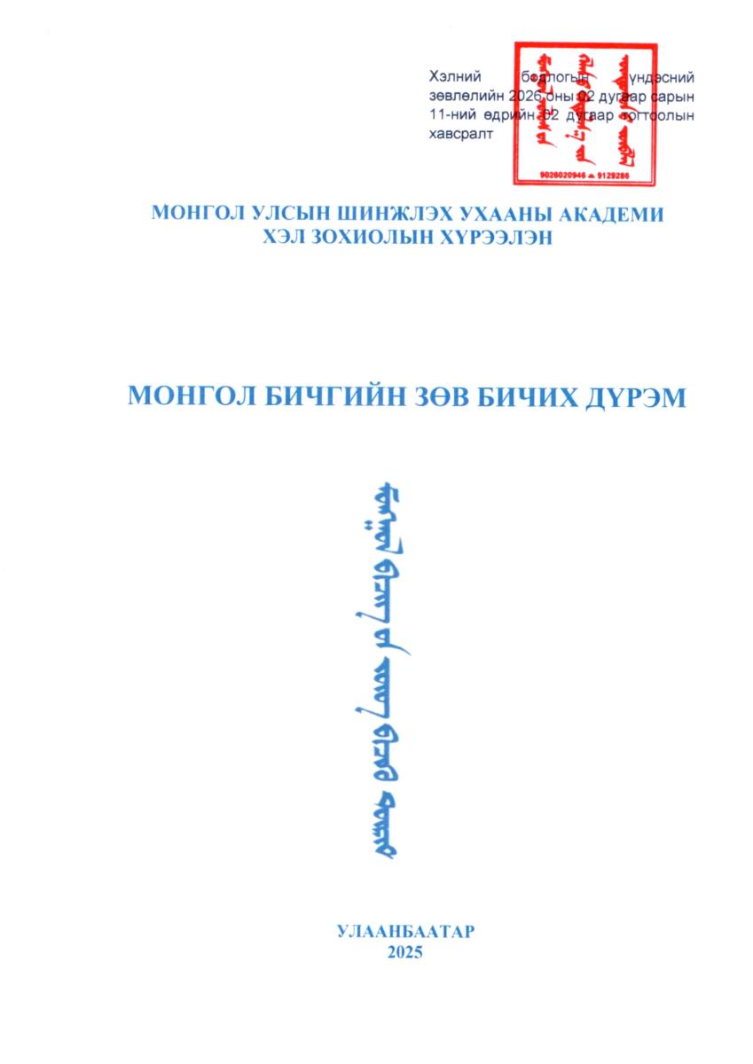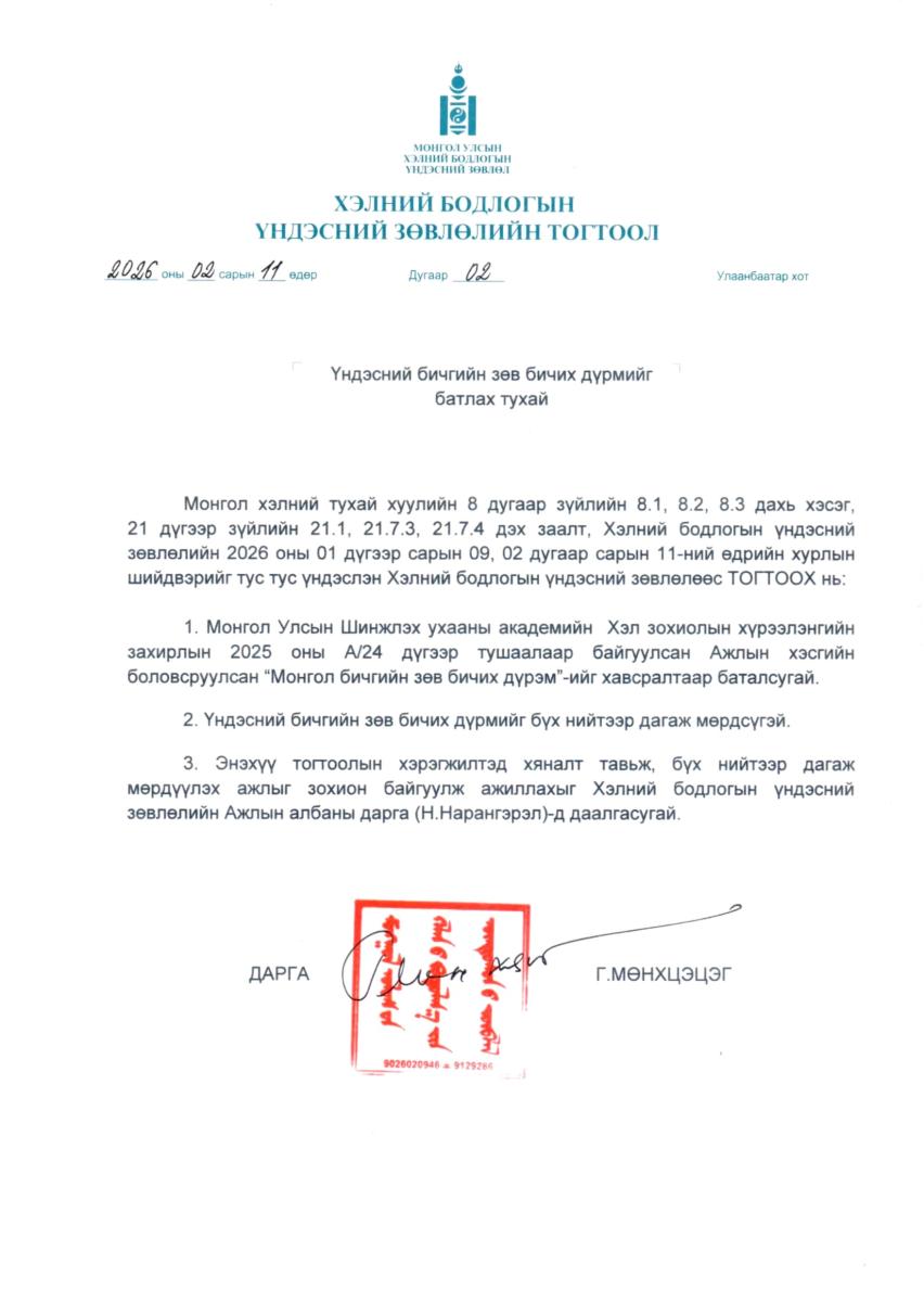 Монгол хэлний тухай хуулийн 8 дугаар зүйлийн 8.1, 8.2, 21 дүгээр зүйлийн 21.7.3 дахь заалтыг хэрэгжүүлэх хүрээнд Шинжлэх Ухааны Академийн Хэл зохиолын хүрээлэнгийн Ажлын хэсгийн боловсруулсан “Монгол бичгийн зөв бичих дүрэм”-ийн төслийг Хэлний бодлогын үндэсний зөвлөлийн 2026 оны 01 дүгээр сарын 09-ний өдрийн Анхдугаар хурал, 2026 оны 02 дугаар сарын 11-ний өдрийн Ээлжит бус хурлаар тус тус хэлэлцэж, бүх нийтээр дагаж мөрдөх Үндэсний бичгийн зөв бичих дүрмийг эцэслэн баталлаа.